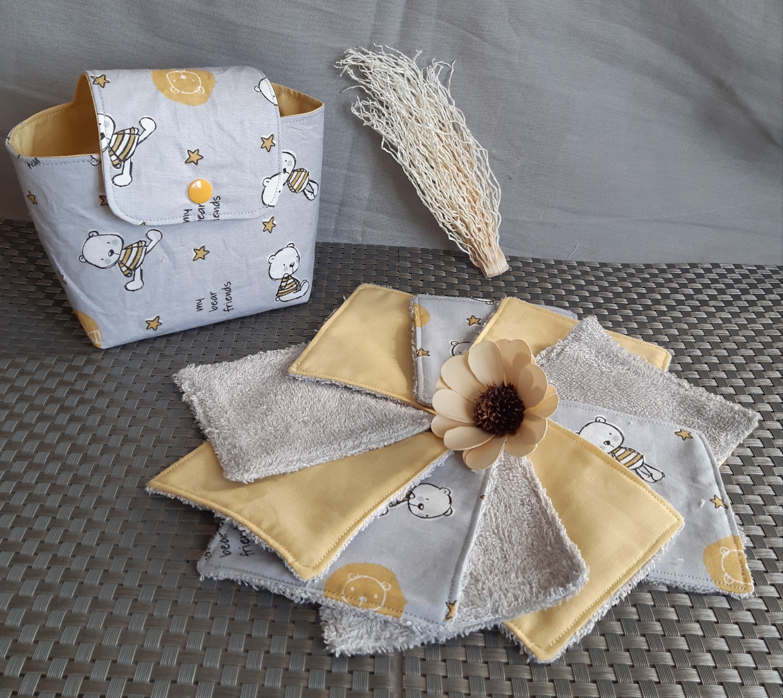 Sacoche en coton oeko tex avec une pression pour fermer celle ci et ainsi ne pas laisser échapper les éponges.