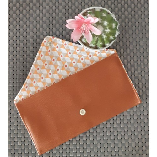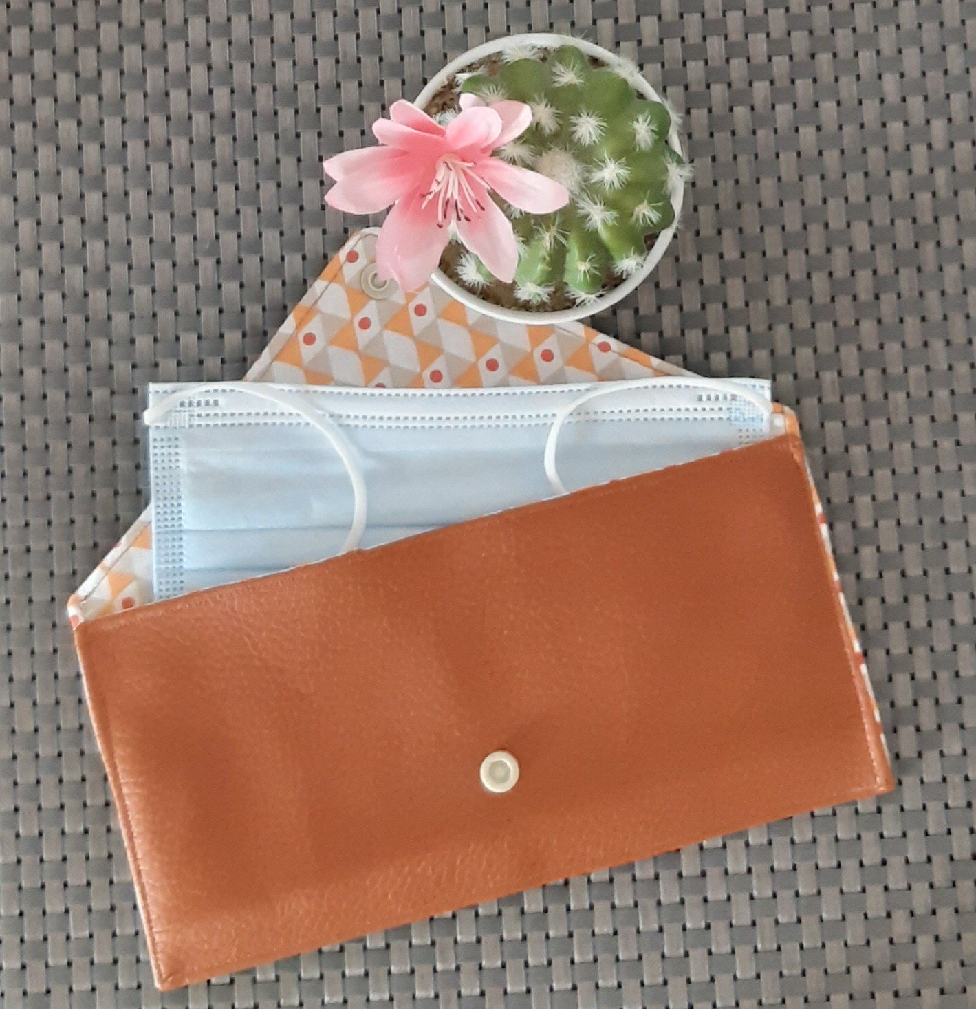 Pochette pour masque en simili cuir marron clair.